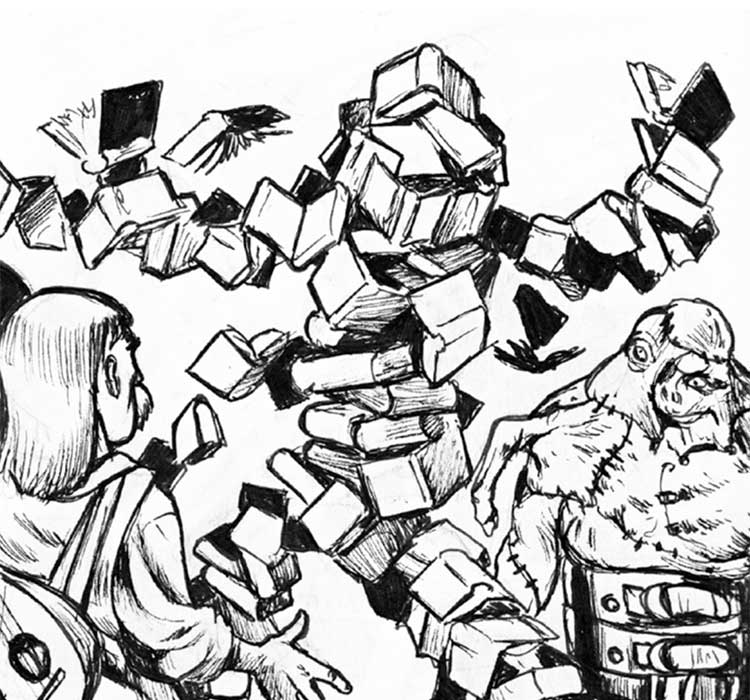 If you want to go with less magic in your stacks, you can make up for it by naming some of the mundane books assembled in the lumbering pile. Two good sources for such are The Dungeon Alphabet (see page 9) and Fishwife’s 100 Oddities for a Wizard’s Library; both include some really good ideas.